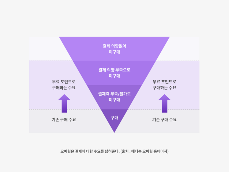 오퍼월은 이런 시장 배경 속에서 다시 주목받고 있습니다. 단순히 인앱 결제 상품을 만들고 포인트 제도를 도입한다고 해서 리텐션과 수익이 저절로 증가하지는 않습니다. 사용자에게는 자연스러운 포인트 적립과 유료 상품 사용 경험이 필요합니다. 이를 위해 유료 결제 이상의 다양한 선택지를 제공하고 서비스 경험을 해치지 않는 트리거가 필요하죠.