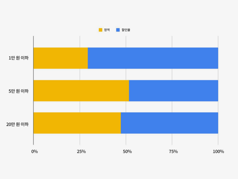 일단 할인 쿠폰이 서비스 활성화에 어느 정도 효과가 있다는 걸 알았어. 그렇다면 할인 쿠폰은 어떻게 설계해야 할까? 가장 먼저 “정액 할인이냐, 할인율이냐?”라는 선택지가 있을 것 같아. 정액 할인은 구매 가격에 상관없이 특정 금액을 할인해주는 형태라면, 할인율은 총 구매 가격에 비례해 일정 비율을 할인해주는 형태야. 물론 구매하는 금액에 따라서 할인폭이 달라지겠지? 먼저, 처음 방문하는 쇼핑몰에서 ‘1,000원 할인 쿠폰’과 ‘10% 할인 쿠폰’이 주어졌을 때 무엇을 선택하고 싶은지 물어봤어.